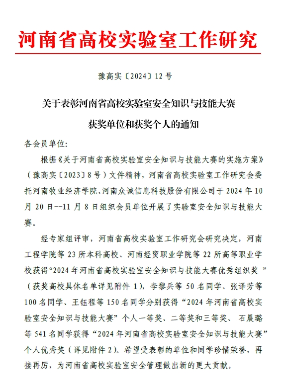 近日,河南省高校实验室工作研究会发布了《关于表彰“河南省高校第四届实验室安全文化宣传月”优秀组织奖获奖单位的通知》(豫高实〔2024〕11号)和《关于表彰河南省高校实验室安全知识与技能大赛获奖单位和获奖个人的通知》(豫高实〔2024〕12号),我校荣获“河南省高校第四届实验室安全文化宣传月”优秀组织奖和“河南省高校实验室安全知识与技能大赛”优秀组织奖。