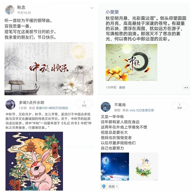 作为中华民族重要的传统节日之一,中秋节承载着人伦孝悌的血脉亲情、民族团结和国家一统融合的愿望,具有着浓厚的历史文化底蕴。今后,院团委将继续在青年师生中广泛开展主题鲜明、内容丰富、形式多样的群众性节日文化活动,发挥优秀传统文化的引领作用,引导广大青年师生认知、尊重、弘扬和传承中华优秀传统文化和传统美德,着力营造文明、和谐、团结、幸福的节日氛围。