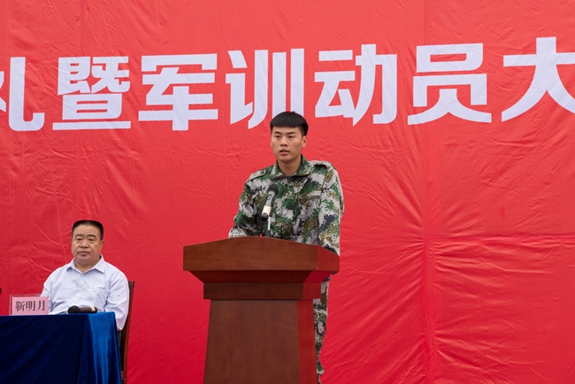 信息与艺术设计系学生张振华作为新生代表立誓:2019级全体新生将秉持“明德致远、树人合一”的校训,脚踏实地认真学习,积极投身军事训练,努力锤炼过硬品格,成为最棒的自己。