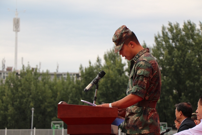 刘国鑫代表所属部队和全体军训教官发言,全体教官将严格按照学院要求,按纲施训,以良好的军人形象和过硬的军事 技能带领同学们磨练意志、锤炼品格,增强集体意识和纪律观念,不辜负部队及学院的信任和重托。