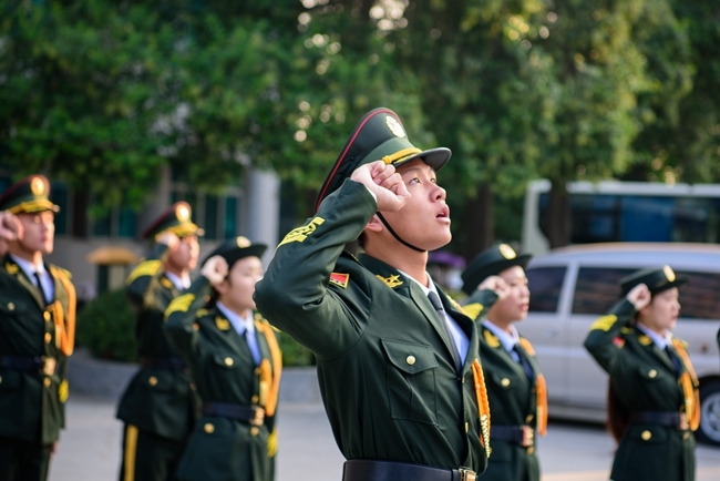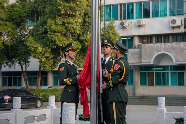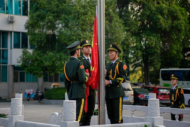 伴随着《歌唱祖国》悠扬的旋律,国旗护卫队以整齐划一、铿锵有力的步伐正步而出,庄严的升国旗仪式拉开帷幕。当雄壮的《义勇军进行曲》响起,全体师生面向国旗行注目礼、齐声高唱国歌,气氛昂扬热烈,温暖感人。