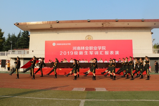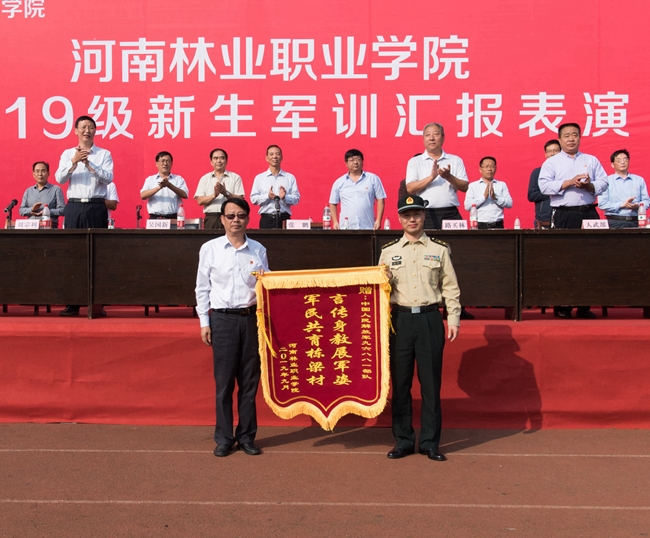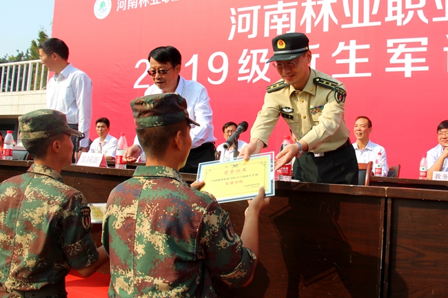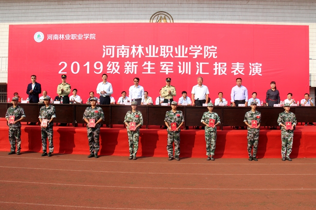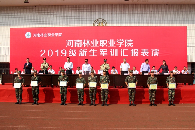 团委书记马丹丹宣读《河南林业职业学院关于表彰军训先进集体及个人的决定》,2中队、4中队、8中队、13中队、14中队、19中队、23中队、27中队、28中队荣获“军训先进中队”荣誉称号;郭乃乐等138名学生荣获“军训先进个人”荣誉称号。