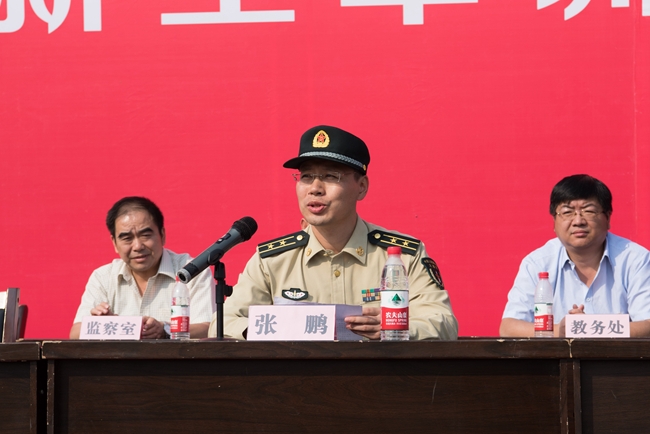 张鹏代表所属部队和全体教官向参训学员表示祝贺,希望同学们在今后的学习生活中珍惜韶华,发扬军训培养的不怕苦累、勇敢顽强的坚韧品质,发扬严格自律、令行禁止的良好作风,发扬团结一致、勇争第一的进取精神,在学习中锻炼自己、塑造自己、展示自己,把自己培养成为一名政治坚定、品德高尚、知识广博的新时代青年。