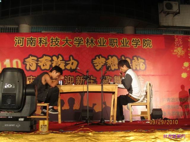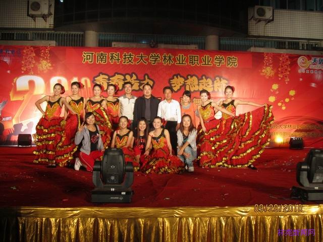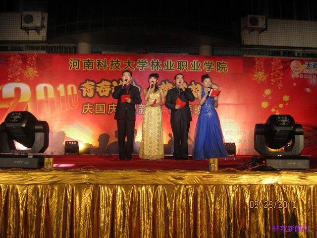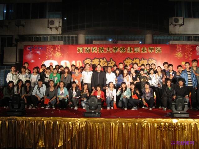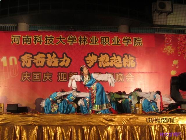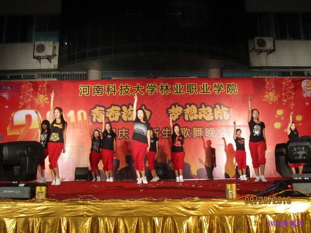 929晚七点半,河南科技大学林业职业学院以“青春活力 梦想启航”为主题的2010年“庆国庆  迎新生”歌舞晚会在学院办公楼广场隆重举行。