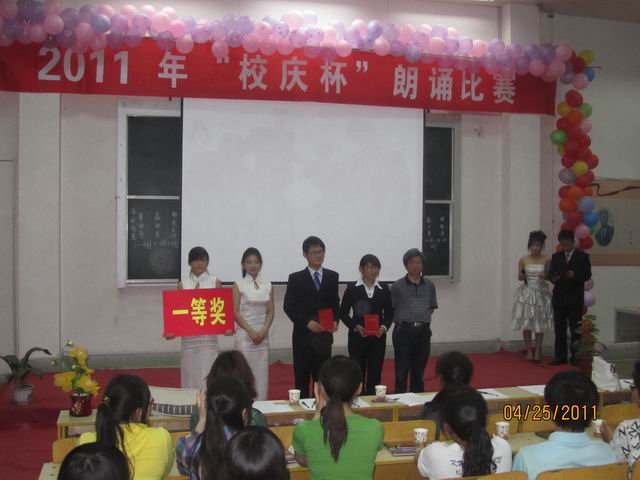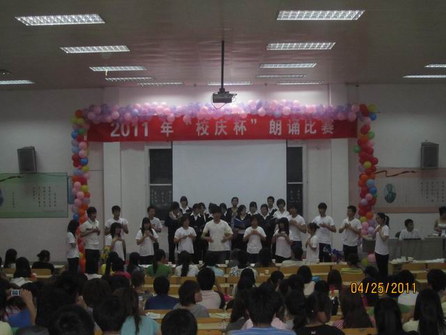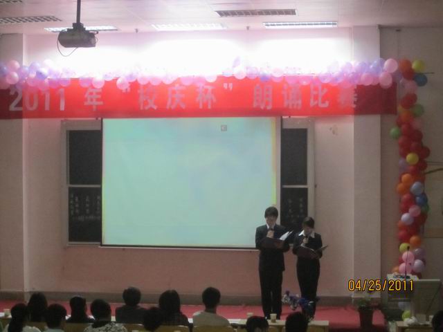 425晚七点半,为迎接学校60华诞,给母校生日增光添彩,由推普协会和演讲口才协会联合举办的2011年“校庆杯”朗诵比赛决赛在西阶梯教室顺利进行。参加决赛的十二位选手分别来自不同的系部,是经初赛的严格选拔产生的。