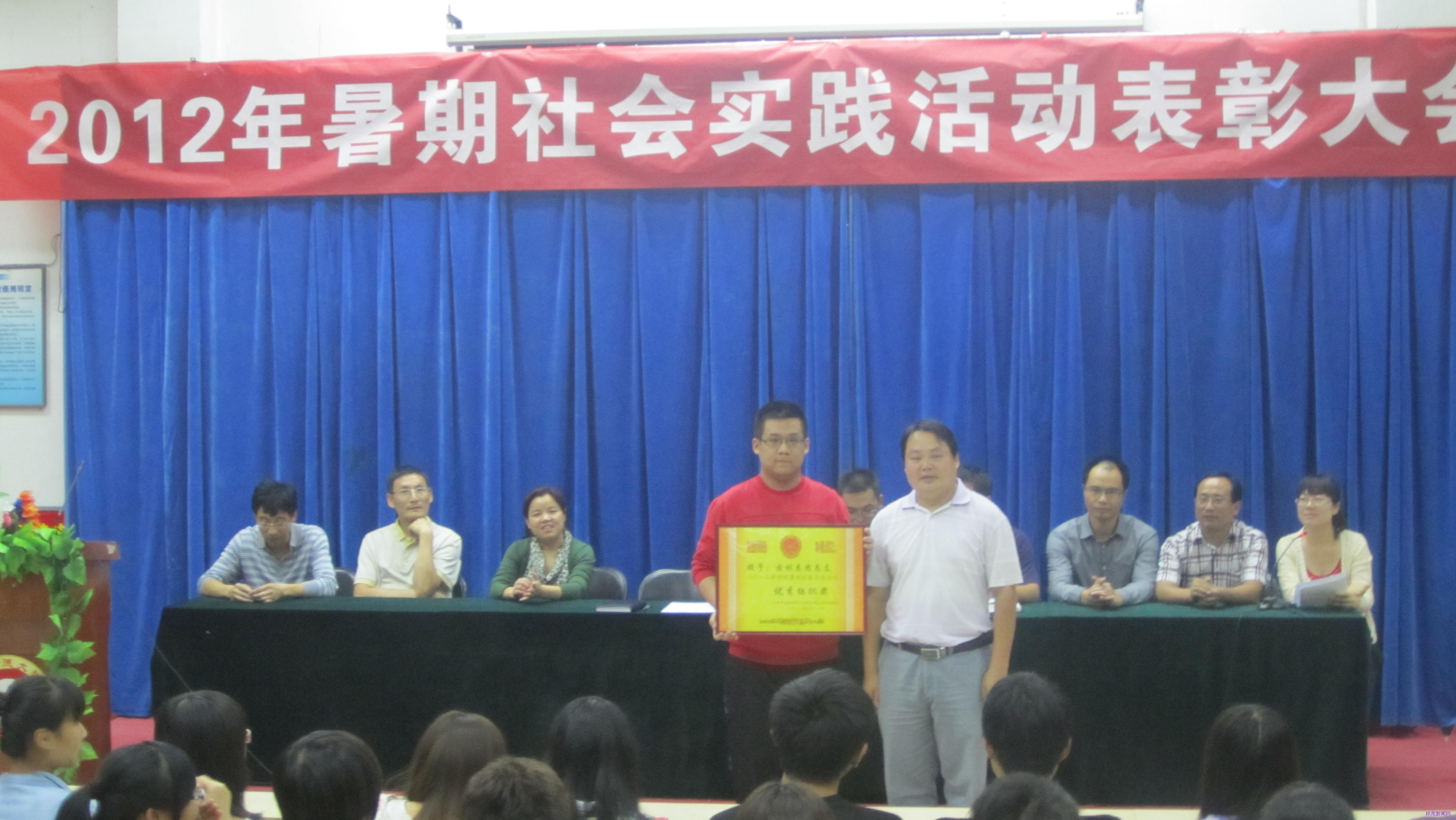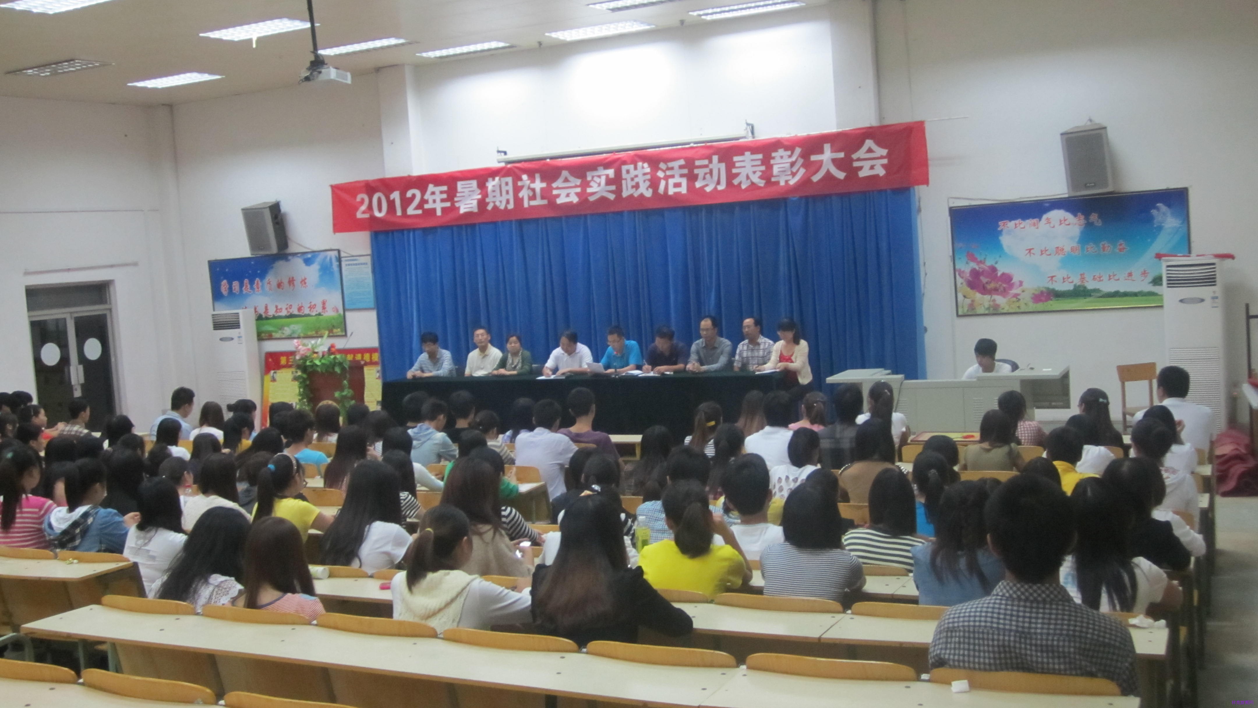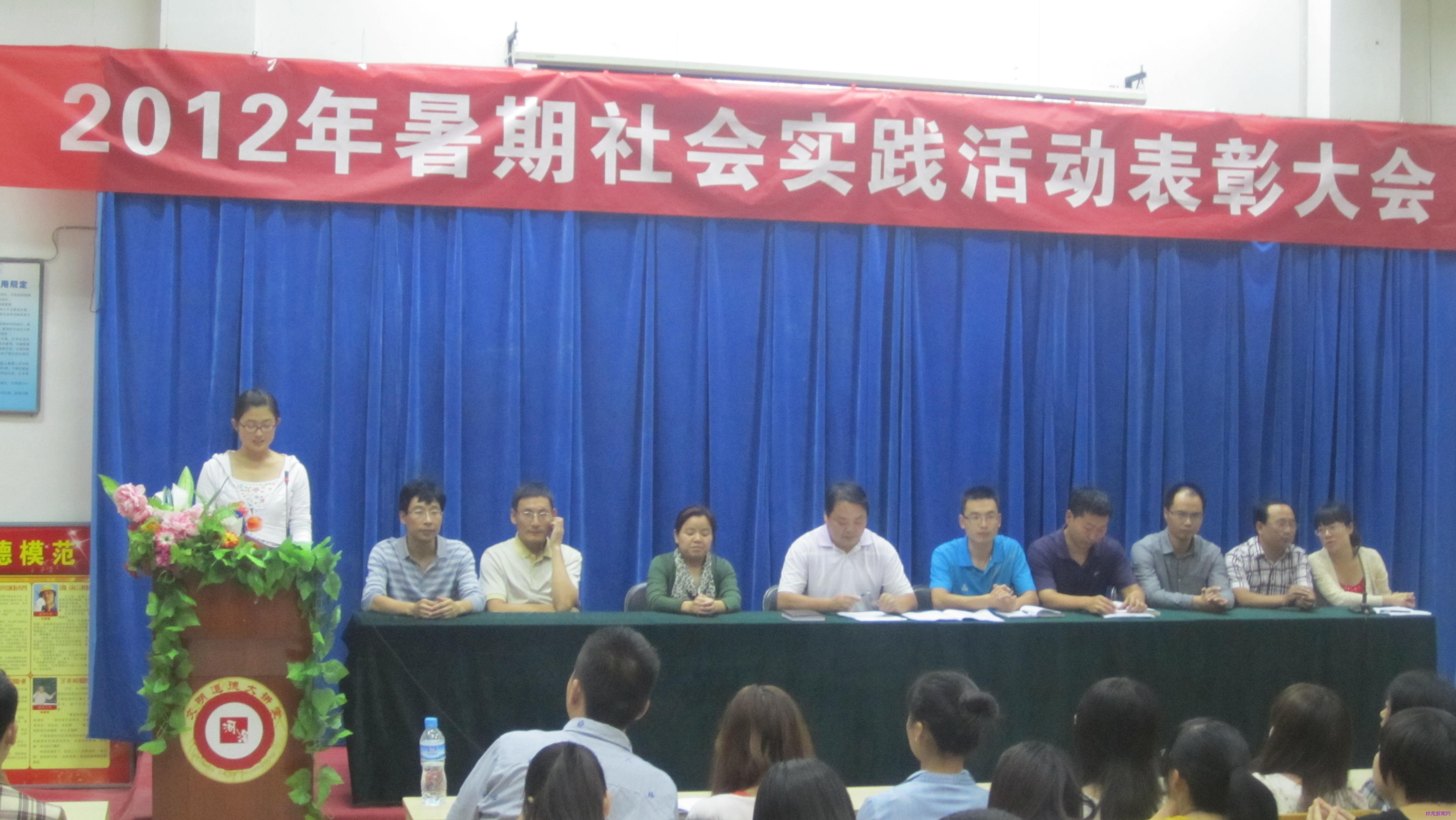 9月18日晚7:30在西阶梯教室,由院团委主办的 2011年暑期社会实践活动表彰大会隆重召开。院长助理刘耀玺、党办主任孙新智、学生处处长姚海雷、副处长刘艳花、团委副书记马丹丹以及四系一部主要领导出席会议。会议由团委副书记马丹丹主持,姚海雷处长宣布了《共青团河南科技大学林业职业学院委员会关于表彰2012年暑期社会实践活动先进集体及个人的决定》,之后进行了隆重的颁奖仪式,受到表彰的先进个人代表和集体分别上台领奖。