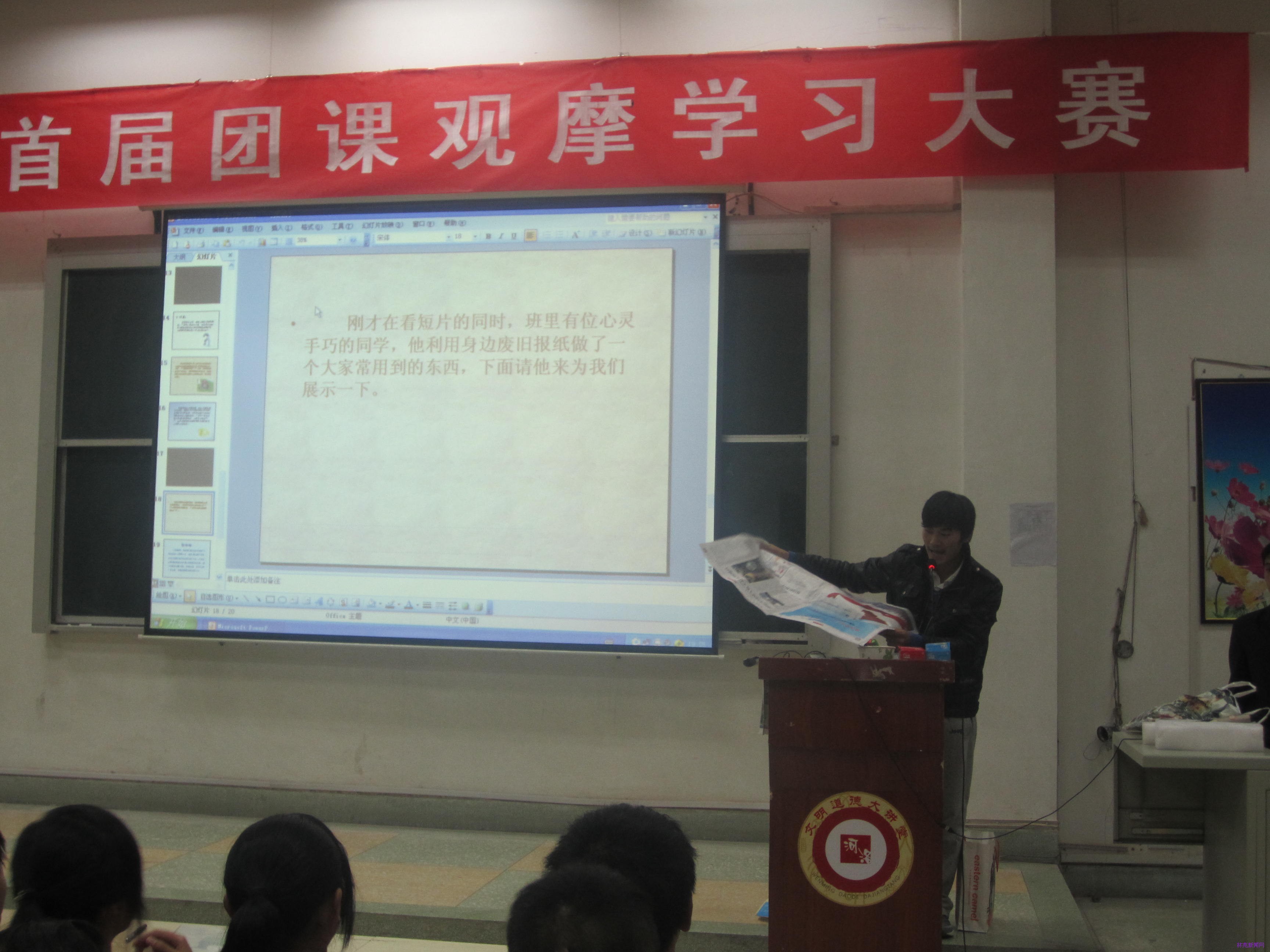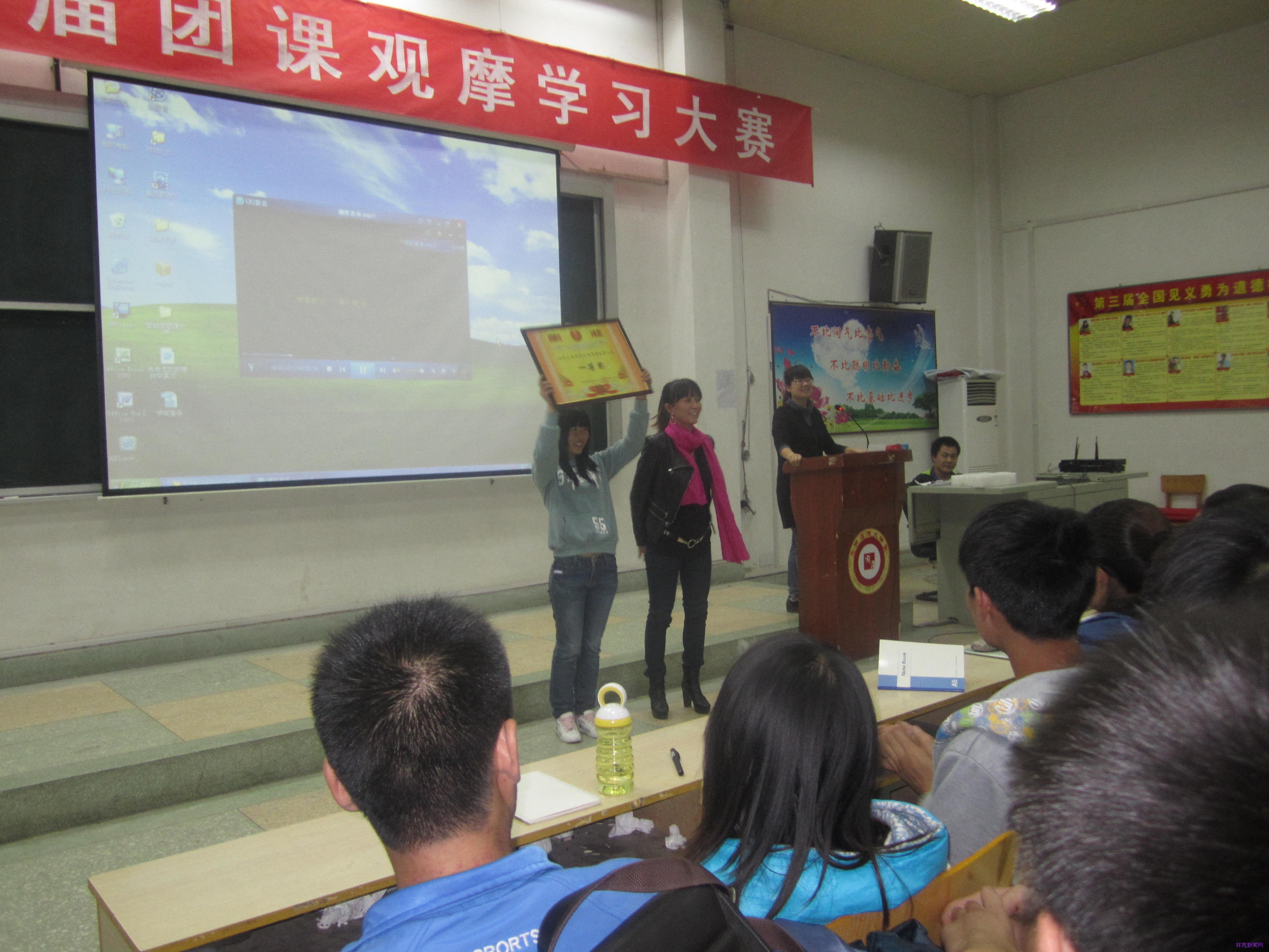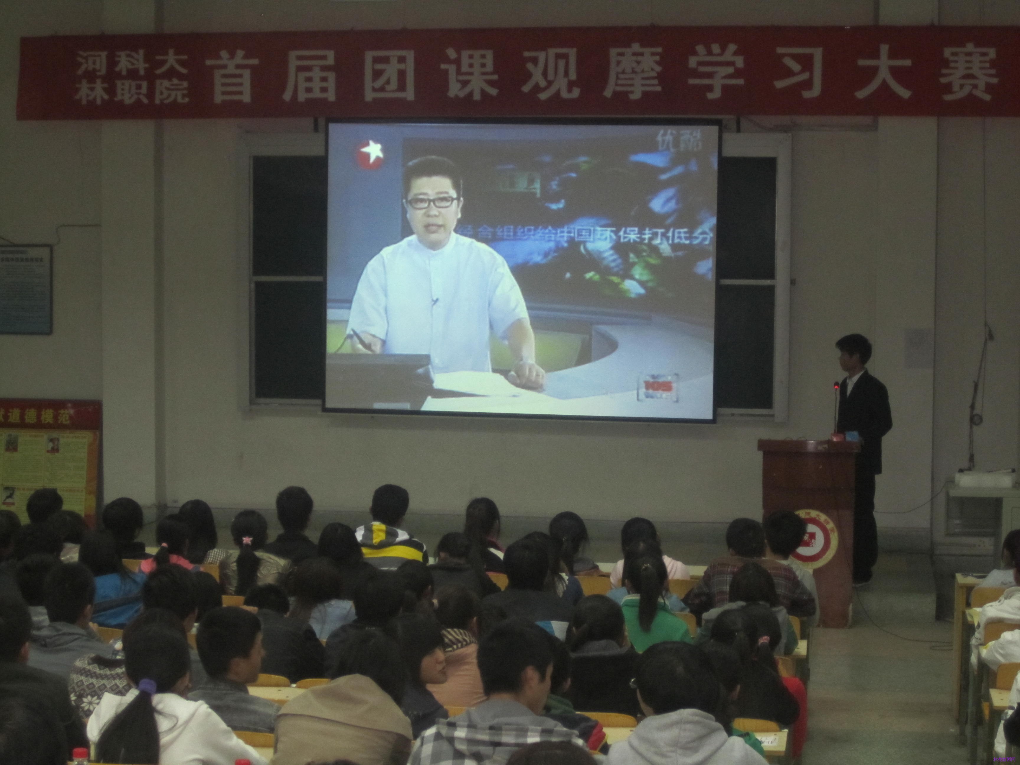 2012年10月22日晚七点,由院团委主办的团课观摩学习大赛在西阶梯教室隆重举行。比赛共进行两天,全校所有班级的团支书参加了此次活动。四系一部经过内部筛选,共推选5个班级精心准备、参加了此次比赛活动。同学们经过了反复的演练,向我们展示了何为优秀的团课。这些团课以“理想、环保、新生的困惑、助人为乐、感悟生活”等为主题,意义积极。各班的团课材料准备地非常充分,由团支书主持,通过带领大家高唱团歌、观看视频、提问、发言、讨论等各种形式使班级同学参与的热情高涨。通过5个参赛班级的团课观摩,同学们不仅获得了一次次深刻、生动的团员意识教育,对以后如何开展团课也有很大的启发和帮助。同学们认真地观摩、学习后纷纷表示受益匪浅,找到了差距,明确了努力方向。