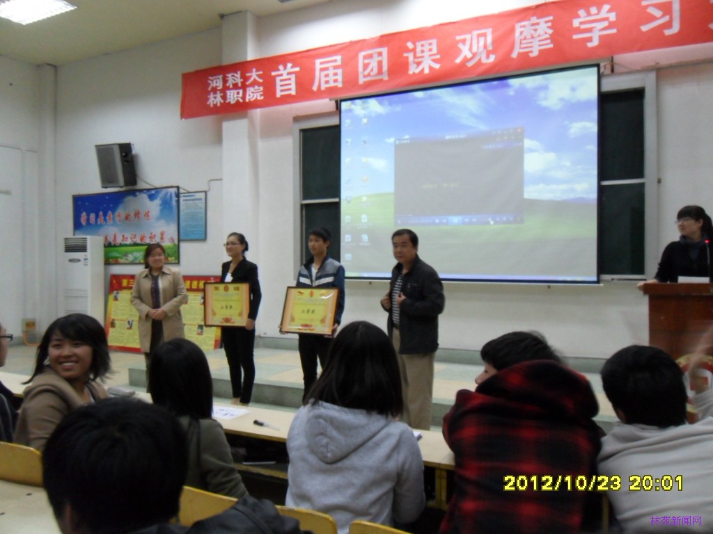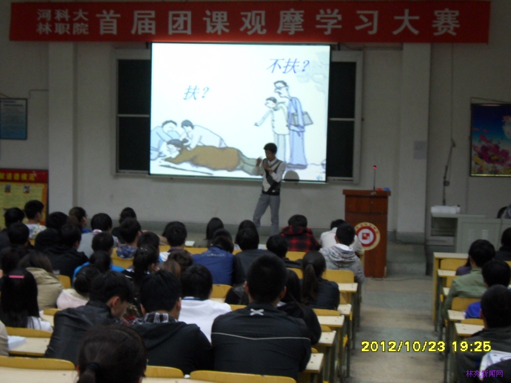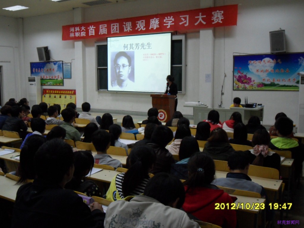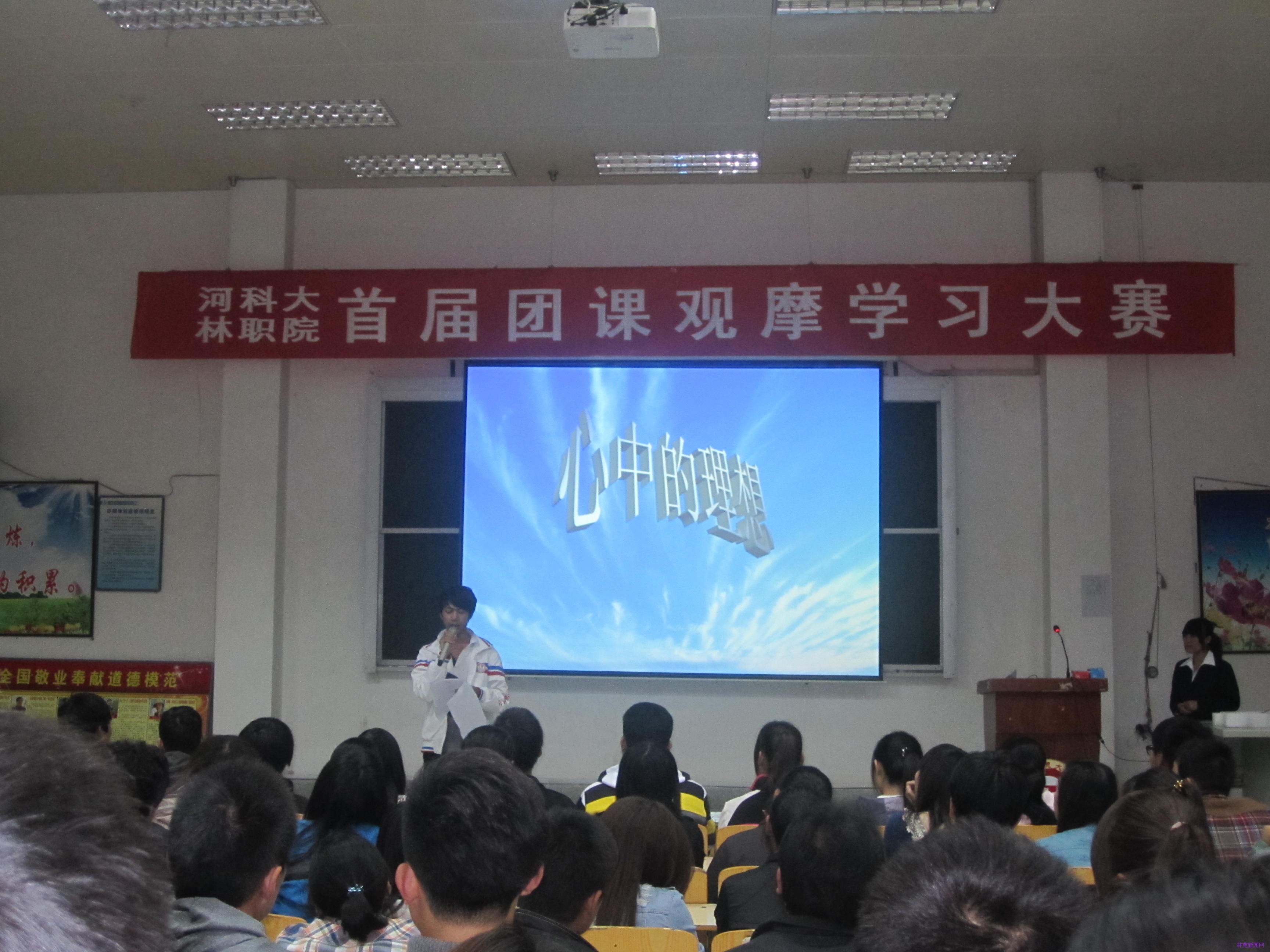 2012年10月22日晚七点,由院团委主办的团课观摩学习大赛在西阶梯教室隆重举行。比赛共进行两天,全校所有班级的团支书参加了此次活动。四系一部经过内部筛选,共推选5个班级精心准备、参加了此次比赛活动。同学们经过了反复的演练,向我们展示了何为优秀的团课。这些团课以“理想、环保、新生的困惑、助人为乐、感悟生活”等为主题,意义积极。各班的团课材料准备地非常充分,由团支书主持,通过带领大家高唱团歌、观看视频、提问、发言、讨论等各种形式使班级同学参与的热情高涨。通过5个参赛班级的团课观摩,同学们不仅获得了一次次深刻、生动的团员意识教育,对以后如何开展团课也有很大的启发和帮助。同学们认真地观摩、学习后纷纷表示受益匪浅,找到了差距,明确了努力方向。