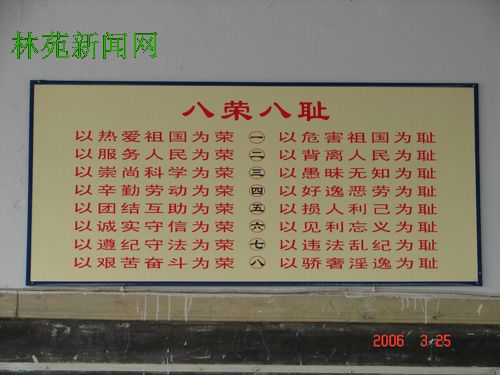 院团委开展以“八荣八耻”为主要内容荣辱观教育 来源:本站原创 发布时间:2006-03-29 10:32:24 浏览次数: 次 【字体:小 大】 胡锦涛总书记在3月4日提出的以“八荣八耻”为主要内容的社会主义荣辱观,在我院师生中引起了强烈反响。为了进一步为我院社会主义荣辱观的宣传教育营造浓厚的氛围,近日,院团委组织了系列主题宣传教育活动,并适时下发了相关的政治学习材料。各团总支、各班团支部以各种形式组织开展了丰富的主题学习和讨论活动。 欢迎同学们点击此处进入讨论区 论坛讨论区 评论 八荣八耻宣传栏 校内宣传栏 (摄影:杨晓红) 分享到: 【打印正文】