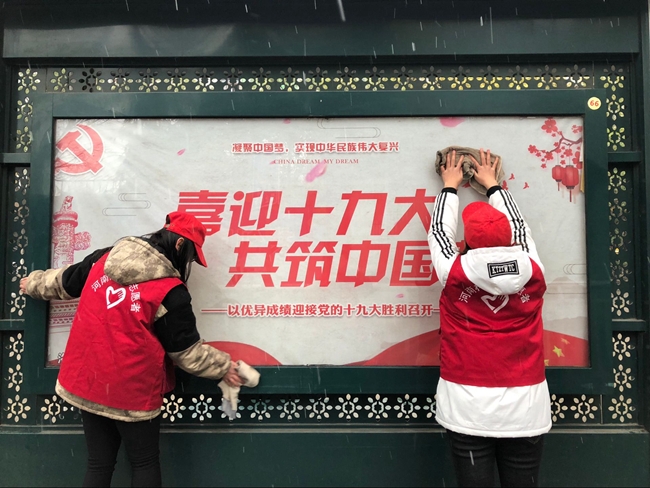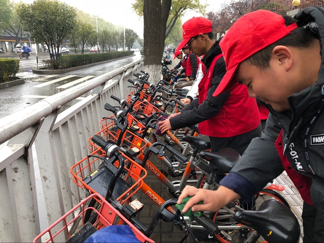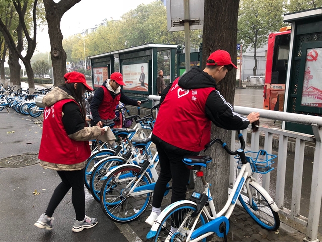 12月5日中午,青年志愿者大队的同学们牺牲午休时间,打扫学院周边的公交站牌、院广场、教学楼教室及楼道卫生,整理中州路两侧的共享单车。