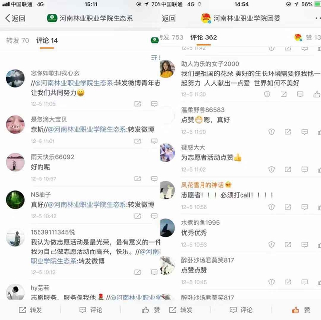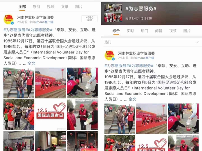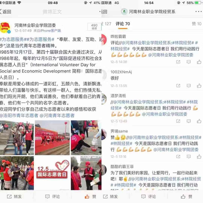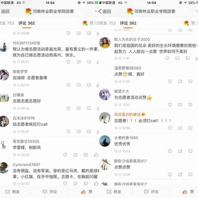 除了线下的志愿活动,院团委还利用微博在线上发起“为志愿服务精神点赞”的话题讨论。同学们纷纷在网络上分享自己成为志愿者以来的感悟和收获,一时间微博上转发、跟帖、评论数量已近千条。