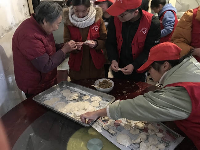 冬至吃饺子,是我国民间的传统食俗。饺子作为阖家团圆欢聚的象征,是冬至不可缺少的节日食品。12月15日一大早,园林系团总支组织学生志愿者来到福乐门敬老院,看望那里的孤寡老人。除了为老人们带去手套、牛奶、香蕉等慰问品,大家还挽起袖子,和那里的老人以及工作人员一起在厨房忙活,和面的和面、调馅的调馅,擀皮的擀皮,当热气腾腾的饺子送到老人们手中时,老人们心里乐开了花。学生们还帮助老人整理床铺、打扫卫生、表演节目为他们送去节日的祝福。