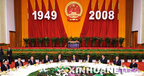 9月29日,国务院在北京人民大会堂举行盛大招待会,热烈庆祝中华人民共和国成立59周年。胡锦涛、吴邦国、温家宝、贾庆林、李长春、习近平、李克强、贺国强、周永康等党和国家领导人与中外人士欢聚一堂,共庆佳节。新华社记者樊如钧摄