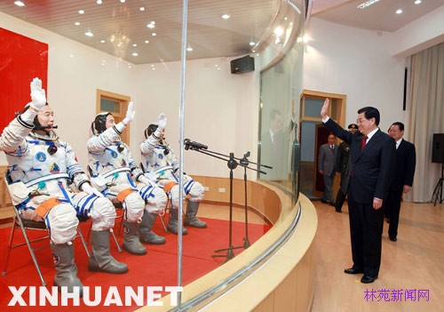 9月25日,中共中央总书记、国家主席、中央军委主席胡锦涛在酒泉卫星发射中心观看神舟七号载人飞船发射。这是胡锦涛等领导同志向即将出征的航天员翟志刚、刘伯明、景海鹏挥手致意。 新华社记者 鞠鹏 摄