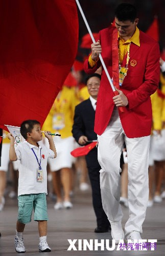 这是8月8日,中国代表团旗手姚明和九岁半的抗震救灾小英雄林浩一起入场。当晚8时,第29届夏季奥林匹克运动会在国家体育场——“鸟巢”隆重开幕。 新华社发(资料照片)