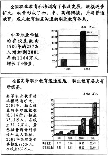 ▲大力改革职业学校招生制度,努力扩大中等职业教育招生规模。中等职业学校进一步放开了招生计划,实行了更加灵活的招生办法;同时,积极扩大招生面向,为农村进城务工人员提供多种形式的职业教育和培训。积极开展社区教育、再就业培训、农村劳动力转移培训等工作,2001年,接受各种形式培训的城乡劳动者达1亿人次。