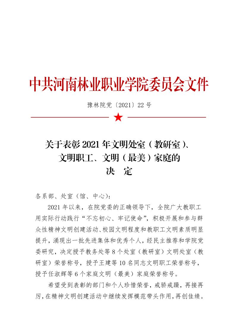 河南林业职业学院关于表彰2021年文明处室(教研室)、文明职工和文明家庭的决定 豫林院党〔2021〕22号 来源:党委办公室 发布时间:2021-10-21 08:19:01 浏览次数: 次 【字体:小 大】 分享到: 【打印正文】