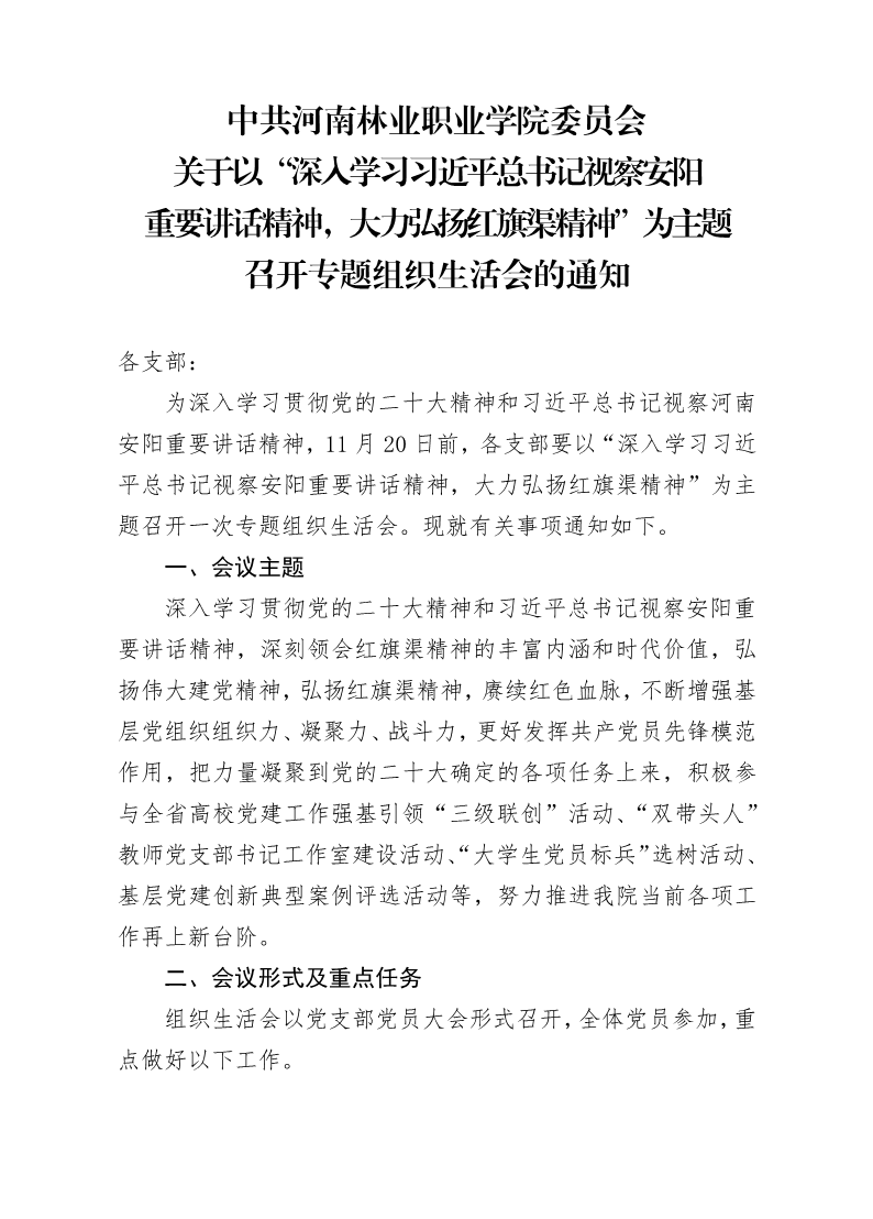 关于以“深入学习习近平总书记视察安阳重要讲话精神,大力弘扬红旗渠精神”为主题召开专题组织生活会的通知 来源:党办 发布时间:2022-11-15 20:31:34 浏览次数: 次 【字体:小 大】 分享到: 【打印正文】