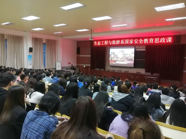 4月14日下午,生态工程与旅游系2019级、2020级在校生在东阶梯同上一堂关于国家安全教育的思政课,课程由思政教研室张延老师讲授。