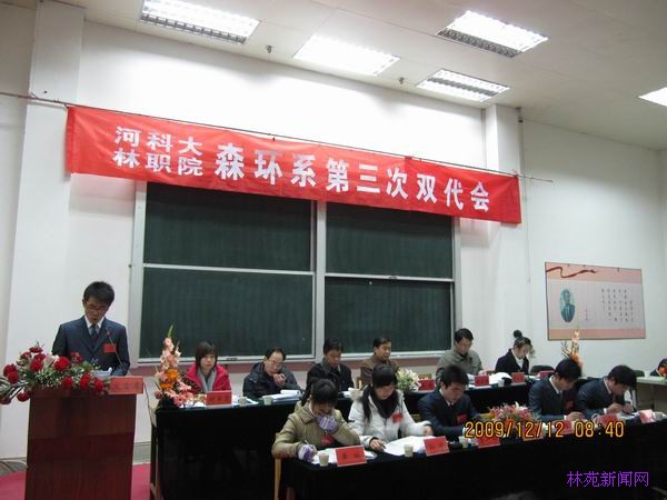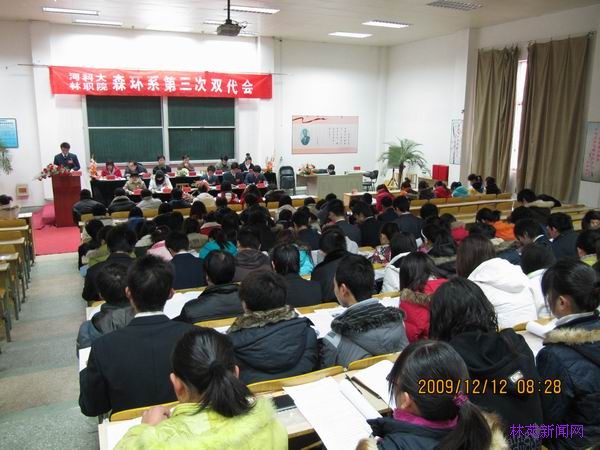 2009年12月12日上午8点,森环系第三次双代会正式会议在办公楼西阶梯教室成功召开。出席本次大会的共有学生代表114名,列席代表13名,森环系主任王建、党支部书记刘少华、团支部书记时军霞、蒯兴望老师,受邀出席会议的还有学生处处长李海龙、团委书记姚海雷及其他院系的学生干部。