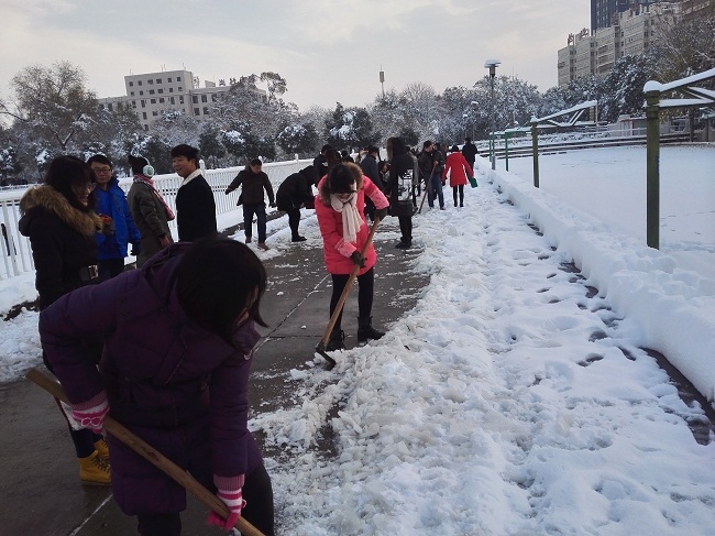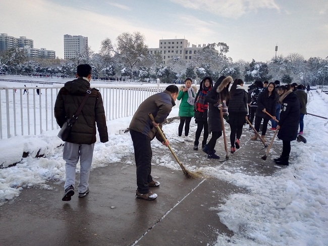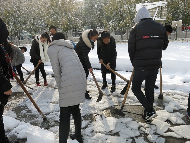 生态工程与旅游系组织义务除雪活动 来源:本站原创 发布时间:2016-11-28 10:06:33 浏览次数: 次 【字体:小 大】 2016年冬的第一场雪带着春的信息飘然而至,使大地万物银装素裹,变为童话般的世界。但道路上厚厚的积雪也学校师生的出行带来了不便。为畅通交通,方便大伙出行,11月23日我系组织师生在第一时间开展了义务扫雪活动。寒风凛冽,也挡不住大家的热情似火,老师和同学们拿起铁锹、扫帚甚至锄头等工具,不畏严寒,积极主动、相互配合、齐心协力,不到两小时就把足球场南北两端的马路清理干净,使大家可以安全出行。 分享到: 【打印正文】