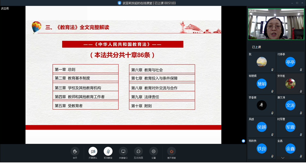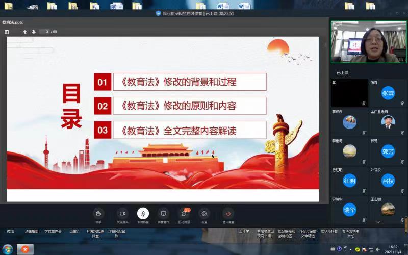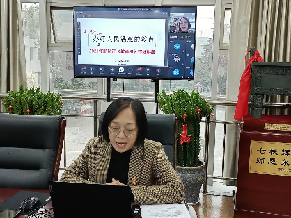 根据省教育厅关于开展“百名法学家百场报告会”活动通知精神,为做好新修订的教育法学习宣传和贯彻实施工作,结合疫情防控要求,我院于11月4日下午4:30采取钉钉直播的方式,举办《办好人民满意的教育--2021年新修订<教育法>解读》专题讲座。本次讲座由思政教研室主任、思政部直属党支部书记武亚莉副教授主讲,学院全体教职工参加学习。