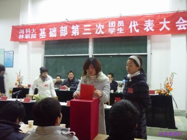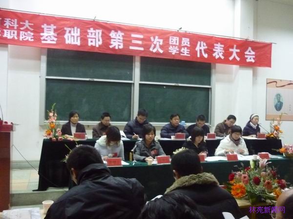 2009年12月6日上午8点整基础部第三次团员学生代表大会正式会议在西阶梯教室胜利召开。出席这次大会的是来自我部各个班级的125名学生代表,其中有优秀学生干部、三好学生、优秀团员、少数民族学生代表。另外,受邀出席会议的有学生处、团委领导及其他系部的学生干部。本次大会的任务是:认真总结第三届团总支学生会成立以来的工作情况;讨论决定今后一个时期我部学生工作的主要任务;审议通过《第三届团总支学生会工作报告》及《第三届团总支学生会经费使用情况报告》;选举产生第四届团总支学生会委员。本次大会实行差额选举,从61名团总支学生会委员候选人中成功选出53名委员。学生处李海龙处长、基础部马建国、王秋芳、宋建龙等老师对学生的意见进行了答疑。最后基础部副主任马建国老师做了总结讲话,肯定了第三届团总支学生会这一年来的辛勤劳动和工作成果,鼓励第四届团总支学生会委员从维护全体学生利益出发,发扬务实求真,民主团结的精神,在下一阶段的学生工作中取得令人满意的成绩。