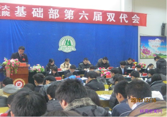 12月16日下午14:00,河南科技大学林业职业学院基础部第六届“双代会”在西阶梯隆重举行。出席本次会议的领导有:院学生处处长姚海雷,基础部党支部书记兼主任李瑞华老师,副主任马建国老师,基础部团总支书记包帅老师和万卉敏老师;到场的嘉宾有基础部各班辅导员、院系学生会主席和团总支书记,以及基础部129名学生代表。