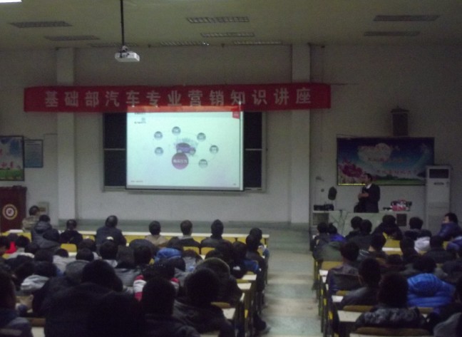 12月12日下午,基础部在综合楼举办了汽车营销专业知识讲座,主讲人为北京顺宝汽车公司邵经理,讲座内容为汽车营销知识的基本概念、市场促销活动的概念和类型、促销活动的规划、执行与评估、常见市场活动介绍及范例,基础部汽车类专业全体师生参加了本次讲座。
