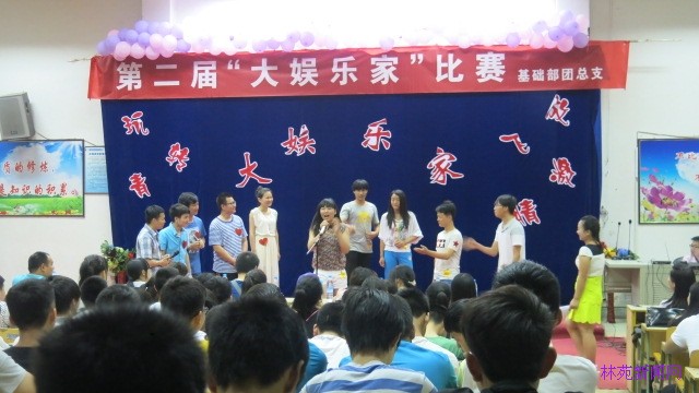 5月26日 晚7:30,基础部团总支举办的第二届“大娱乐家”校园游戏大赛在众多师生的支持与欢呼中拉开帷幕。院团委书记马丹丹、学生处刘艳花、经贸系团总支书记李合英、森环系团总支书记赵迪,园林系团总支书记徐海霞、基础部团总支书记包帅等老师担任本场比赛的嘉宾。