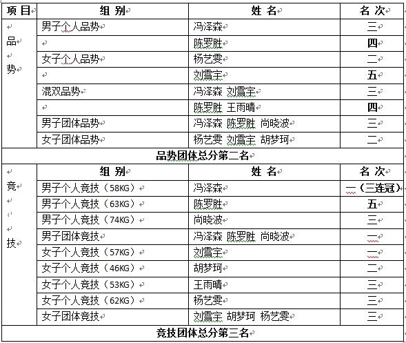 2016年河南省大学生跆拳道锦标赛河南林业职业学院成绩单