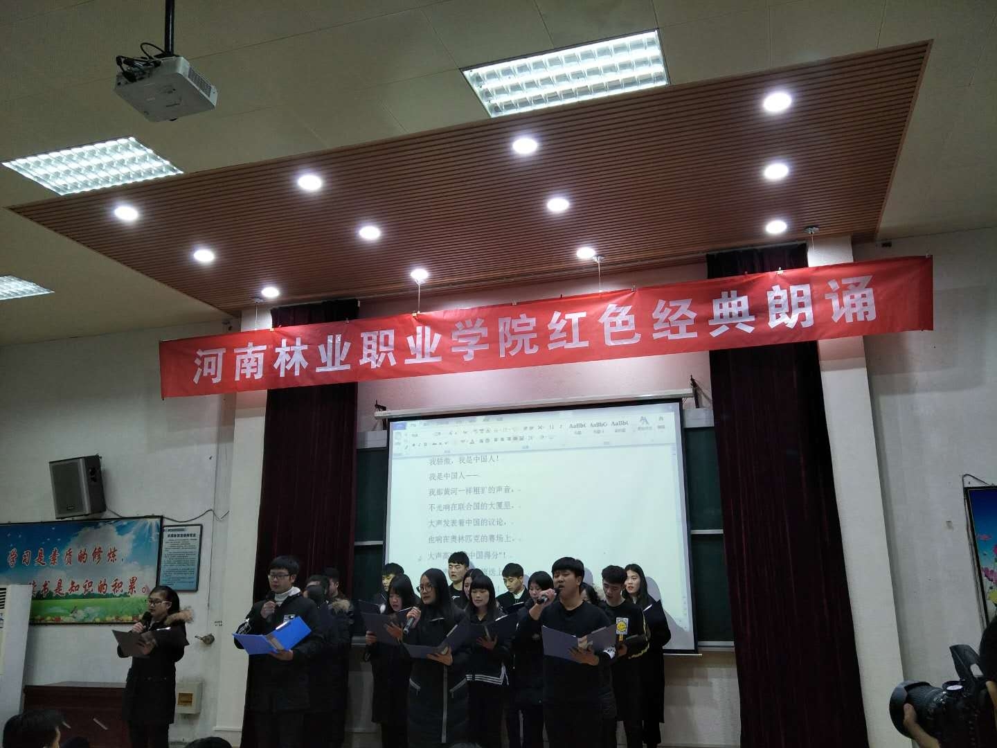 为了深入贯彻落实全国全省高校思想政治工作会议精神和高校思想政治课建设标准,增强思想政治课的时效性和针对性,加强思想政治课实践教学力度,宣传落实十九大报告精神,2017年12月13日晚7:30,思想政治理论课实践小组联合基础教育部组织了2017年度河南林业职业学院红色经典朗诵活动。基础教育部主任李世勇、院办主任王宏生、德育教研室主任刘极霞等老师参加了此次诵读活动。
