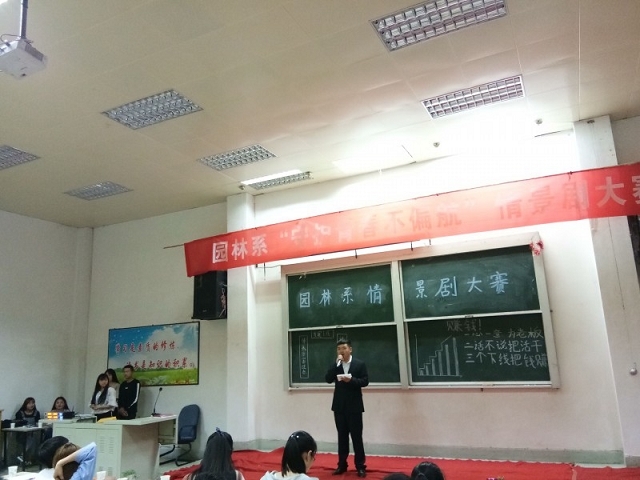为加强高校大学生对各类非法骗局、非法活动的鉴别能力,提升大学生的自我保护意识和维权能力,2018年5月3日晚7点半,由园林系学生会主办的“守护青春不偏航”情景剧大赛在学院东阶梯举办。园林系团总支书记曹晓彩老师和全体辅导员老师出席此次活动并担任评委。