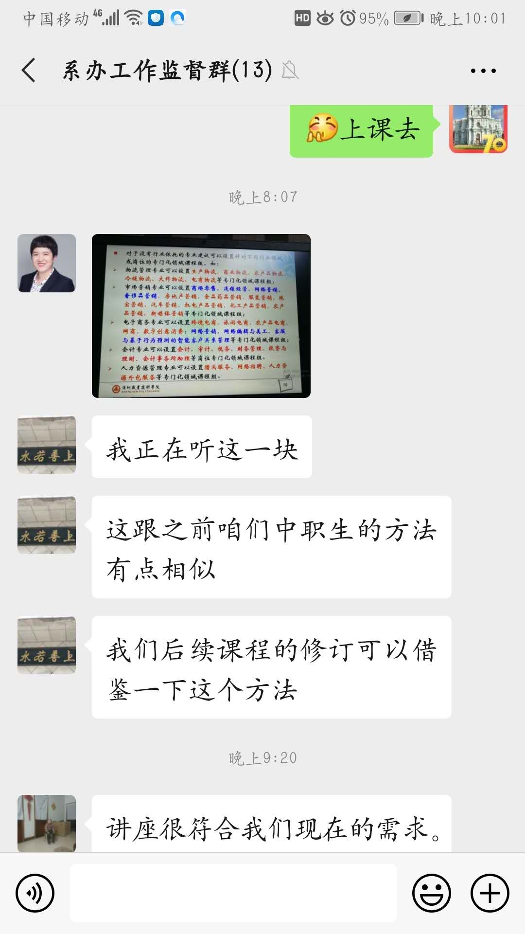 学习内容直击专业人才培养存在的核心问题,例如:就业面向、培养目标与培养规格、课程设置、教学进程总体安排等、在线研读《指导方案》和“1+X证书”制度、传授落实《指导意见》及1+X证书制度的人才培养方案框架设计等。经贸系9位老师一致认为本次学习收获颇多,针对以后课程设置与学时安排之间的关系会更加明朗清晰。根据本次学习,经贸系将深入探讨实践课程的教学比例研究、书证融通、职场品质的教育等具体问题,为创建更好的系部、专业不懈努力!
