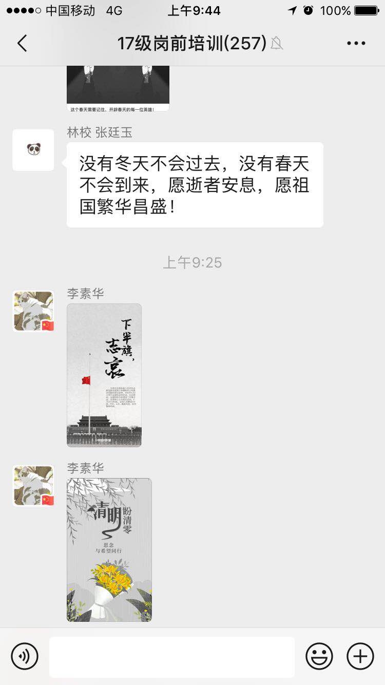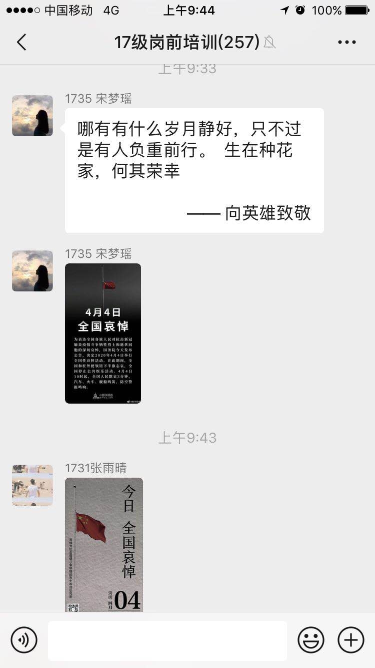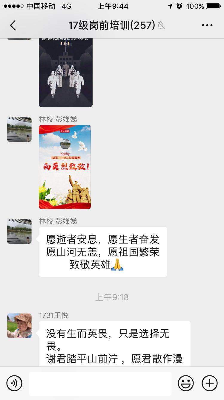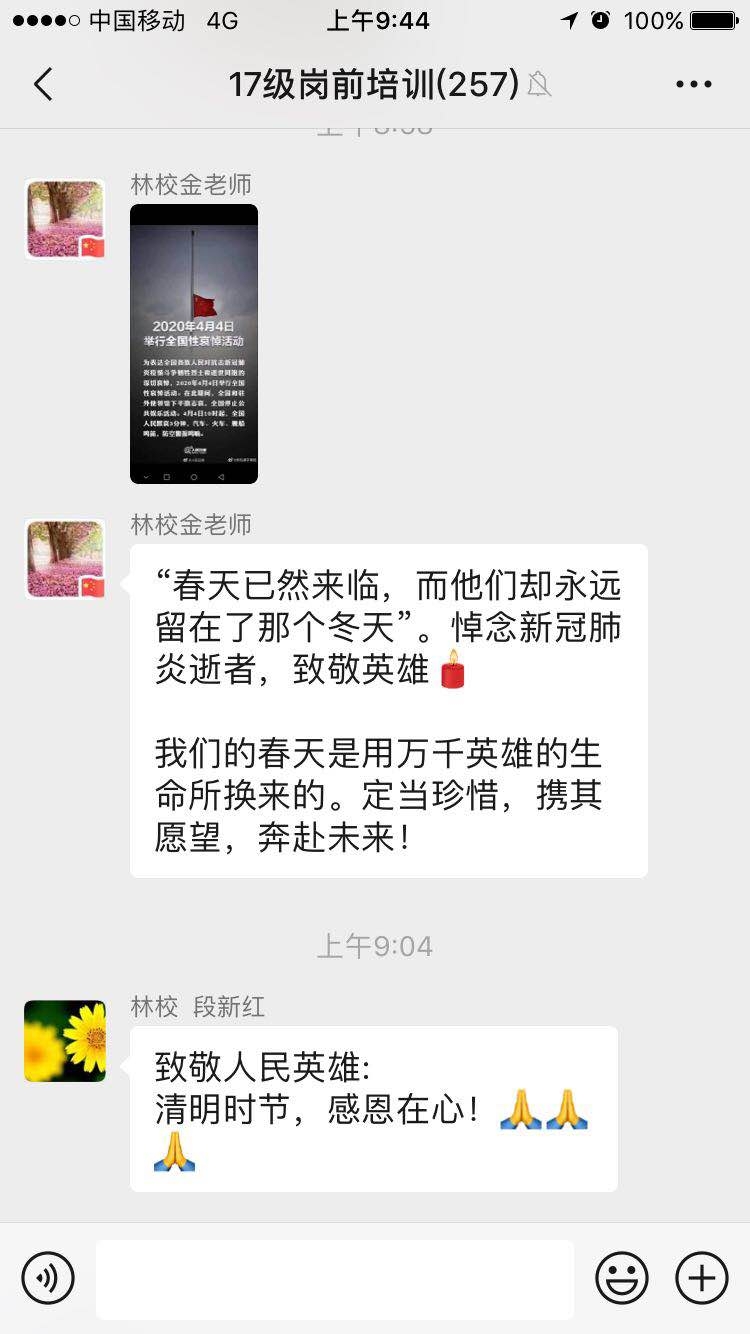 清明节会计教研室举行微信群哀悼活动 来源:经贸系 发布时间:2020-04-04 22:38:47 浏览次数: 次 【字体:小 大】 为表达对抗击新冠肺炎疫情斗争牺牲烈士和逝世同胞的深切哀悼,我院经贸系会计专业积极响应党中央国务院号召,决定2020年4月4日通过微信群举行哀悼活动。上午9时,经贸系教学主任张淑英老师在微信群中发起了云端祈祷的号召,全专业师生纷纷积极响应,向所有因新冠肺炎逝去的同胞和在抗击新冠肺炎疫情战役中牺牲的英雄致敬。不仅仅是这一天,我们会永远记住这个春天,那些平凡与不平凡的付出。青山含泪,寄托哀思,只愿未来家国平安。 分享到: 【打印正文】