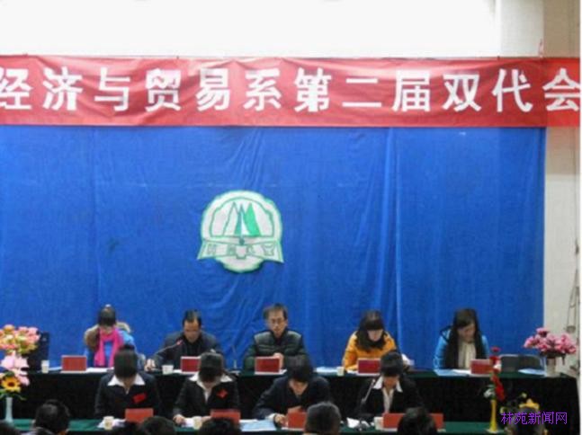 在全国上下欢庆党的第十八次全国代表大会胜利召开之际,河南科技大学林业职业学院经济与贸易系第二届“双代会”于2012年12月9日上午8:00在办公楼西阶梯教室隆重召开。出席会议的领导及老师有:学生处处长姚海雷老师;院团委副书记马丹丹老师;经贸系副主任安存胜老师;经贸系团总支书记李合英老师;经贸系教学秘书石珺老师以及班主任老师。此外,各系团总支副书记和学生会主席也出席了本次会议。