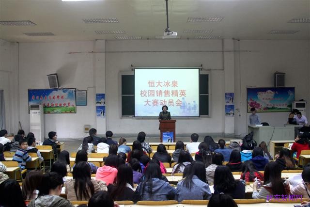 为了给我院学生提供一个实践及就业的实习机会,全面提升他们营销、协调、策划等多方面的能力,为学生今后步入职场积累宝贵经验。经贸系联合恒大饮品有限公司河南分公司举办2014年度大冰泉校园营销精英大赛,为使本次大赛取得良好成绩,2014年3月28日中午,在西阶梯教室举办了赛前动员大会。