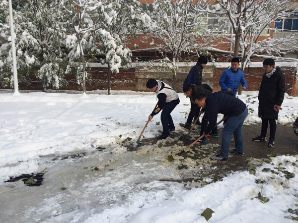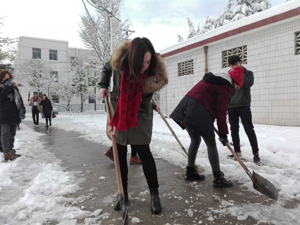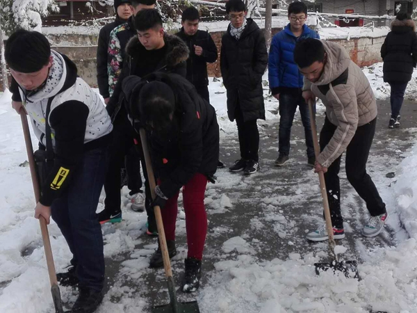 2016年11月22日,洛阳迎来了2016年入冬第一场大雪,洁白的大雪覆盖了河南林业职业学院花草树木和校院的每一条,在欣赏雪景的同时,也给大家的出行和安全带了不便,为此,党委办公室协同后勤服务中心教务处发出通告:为了热烈庆祝第一场暴雪,学校决定明天上午停课半天,所有师生打扫校园积雪。后勤服务中心也有计划地做了详细的分工:1行政工勤:办公楼前广场及南侧的东西路(问礼路),2基础部和学生志愿者:校门外区域以及东西两侧道路各延伸20米,3信艺系:操场以东全部区域含体育场东路,4生旅系:体育场南路、北路,5经贸系:操场西路,餐厅东面的一条南北路(直通到头),6车电系:西寝楼二号公寓前后的两条东西路(直通到头),7园林系:东西阶梯外的两条路以及办公楼前的东西路(林苑大道)。