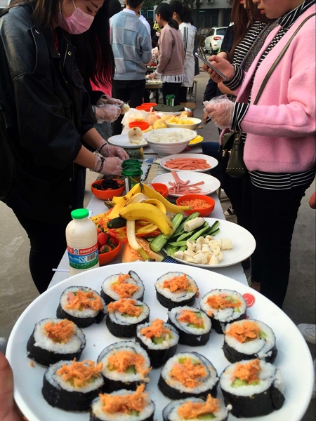 为了增强团结合作,共建温暖大家庭。将同学们按自由结队形式分成8组,每组8人,分别向大家分发水果,海苔,等食材大家随机开始动手创作寿司水果沙拉。