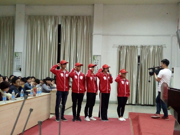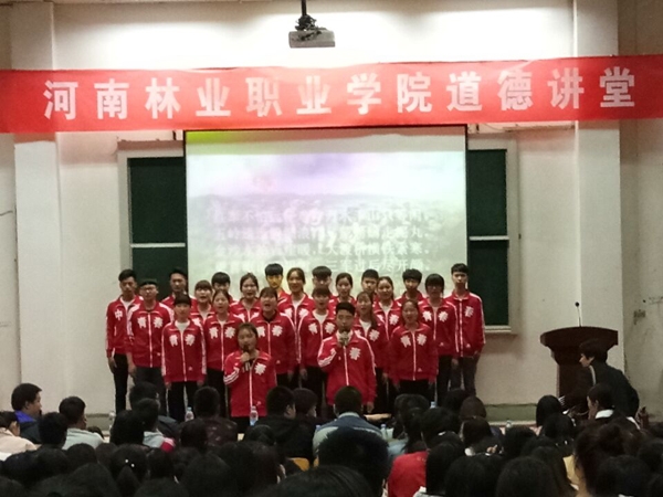 本期道德讲堂以“弘扬社会主义核心价值观,高举爱国旗帜”为主题,共分为:唱歌曲、诵经典、学模范、谈感悟、讲故事、提倡议、看视频、送吉祥八个环节。在主持人的带领下,全场观众合唱《歌唱祖国》为活动拉开了帷幕。随后,团总支全体人员诵读《七律长征》。在学模范中,观看了《国家赋予年轻人的礼物》这一视频。紧接着是电商1632班的刑皓琦同学讲述了《岳母刺字-精忠报国》的故事,让大家体会到岳飞那不屈不挠强烈的爱国精神。之后通过《解读社会主义核心价值观》这一视频,加强了同学们对社会主义核心价值观的认识。最后由团总支工作人员为大家献上一副对联,为本次活动完美收尾。