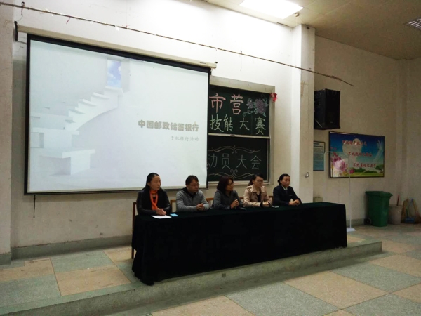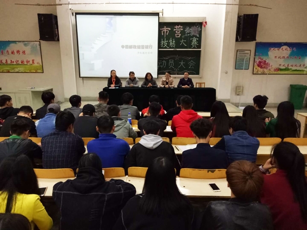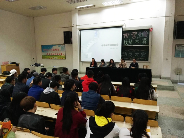 2017年10月12日中午1:40,经贸系在东阶梯教室举办了市场营销技能大赛动员大会。经贸系教学主任张淑英老师、邮储银行支行行长刘阳女士、邮储银行理财经理杨莉莉女士、经贸系市场营销电子商务教研室主任孙长平老师、经贸系教学秘书石珺老师、经贸系市场营销骨干教师刘铮老师以及高职市场营销16-1.2.3班的全体学生都参加了本次大会。
