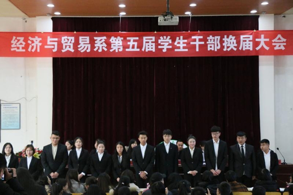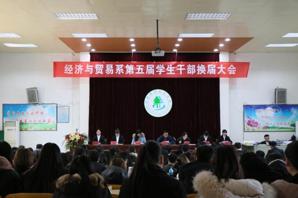 2017年12月19日,河南林业职业学院经济与贸易系在西阶梯举办第五届学生干部换届大会。出席本次会议的有经贸系党支部书记李继东老师、团总支书记王东岳老师、教学秘书石珺老师以及全体辅导员老师。全体学生干部参加了此次会议.