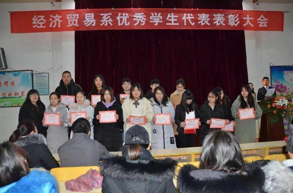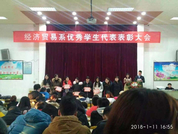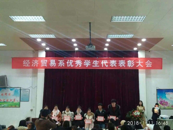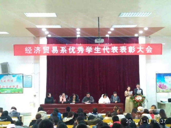 1月12日下午,经贸系优秀学生代表表彰大会在西街梯举行。出席此次表彰大会的嘉宾老师有:经贸系党支部书记李继东老师, 教学主任张淑英老师 ,经贸系团总支书记王东岳老师, 经贸系教学秘书石珺老师 ,会计教研室主任金鑫老师 ,市营电商教研室主任孙长平老师, 市场营销学科带头人牛永超老师, 电子商务学科带头人刘晓红老师 ,以及经贸系全体教师、班主任、辅导员们。