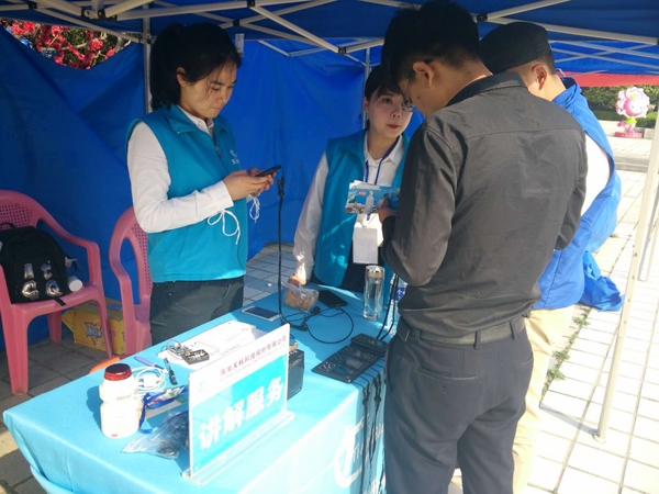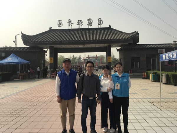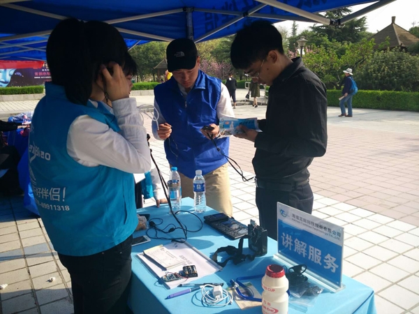 “花开花落二十日,一城之人皆若狂”,今年牡丹文化节又已悄然而至。我系与海南天标科技股份有限公司合作的花会实习也拉开帷幕。4月3日一大早,刘铮老师前往本次实习点之一的国家牡丹园看望正在实习的同学们,恰巧有一位客人正在摊位旁边向几位同学咨询智能导游机的用法,同学们向客人详细介绍了其功能和优点,不出两分钟便出租给该客人一台智能导游机。在洛阳桥南的国花园实习点,同学们告诉老师,从昨天开始客流量就已经很大了,智能导游机的出租量也是连连攀升。在关林庙实习点,天标公司配备了一名工作人员在此处并且安排了一位同学协助工作,预计清明节后客流量也会剧增。