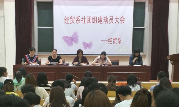 2018年5月14日,经贸系在西阶梯教室举行社团组建动员大会,系副主任张淑英、教学秘书石珺、会计教研室主任金鑫、市营电商教研室主任孙长平、团总支书记王东岳作为特邀嘉宾出席会议。经贸系各专业教师们、辅导员班主任和各班班干部参加了此次会议。会议由石珺主持。