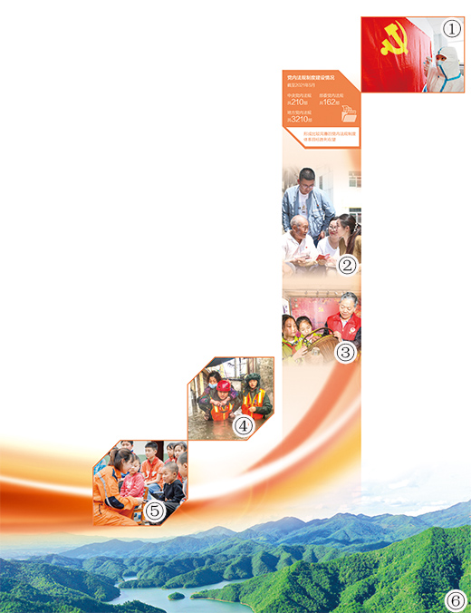 ——建设坚强战斗堡垒。党中央先后制定和修订了党内政治生活若干准则、党组工作条例、地方党委工作条例、党的工作机关条例、支部工作条例以及农村、国企、机关、高校基层党组织工作条例等一系列组织建设方面的党内法规,搭建起组织法规的“四梁八柱”。在党中央集中统一领导下,中央和国家机关、地方党委认真贯彻落实党中央决策部署,广大党员的先锋模范作用和基层党组织的战斗堡垒作用更加突出,推动党和国家事业取得历史性成就。