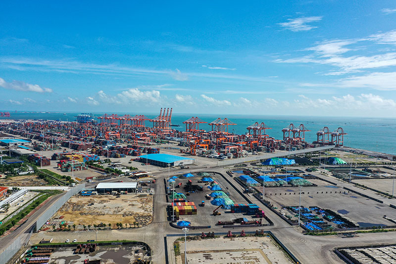 这是2022年8月27日拍摄的位于平陆运河出海口附近的北部湾港钦州港区大榄坪作业区(无人机照片)。新华社记者 曹祎铭 摄