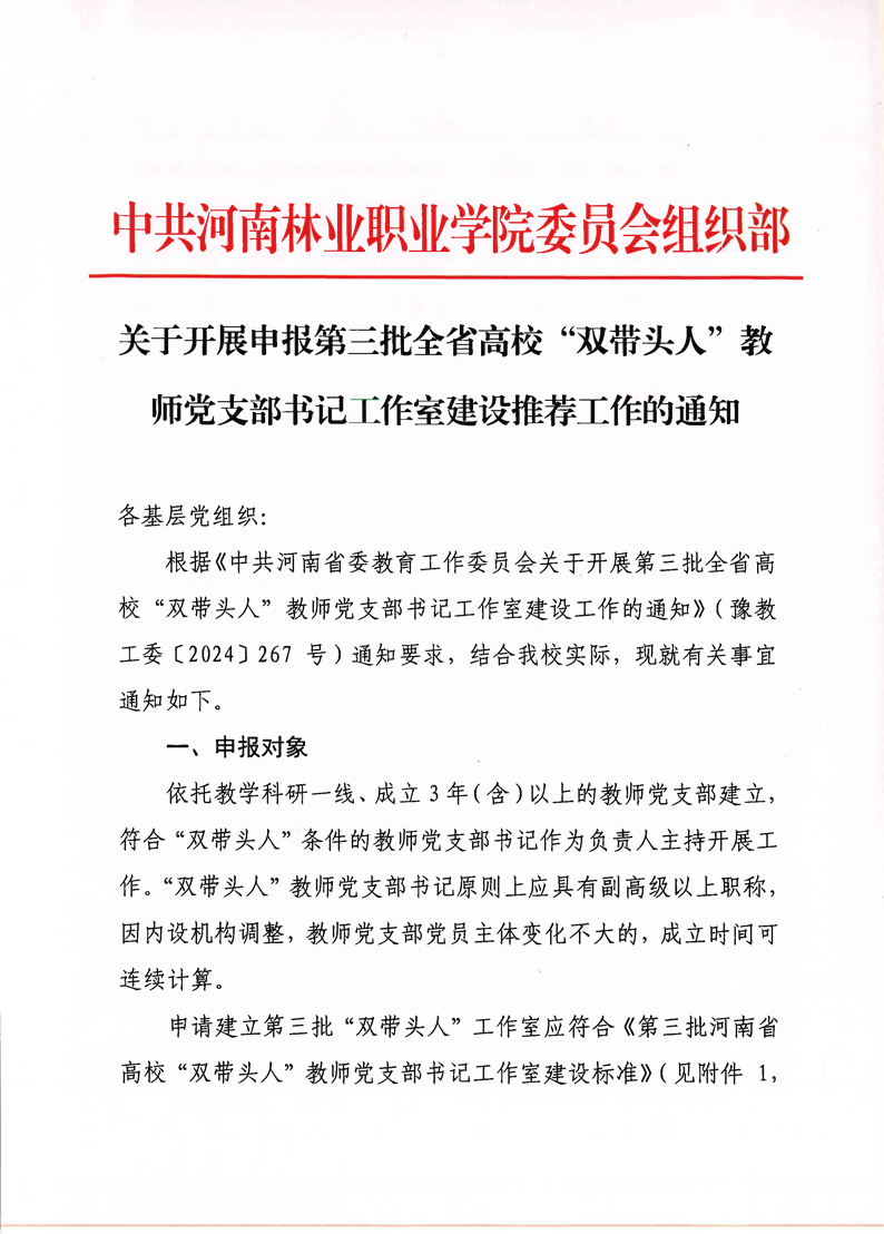 关于开展申报第三批全省高校“双带头人”教师党支部书记工作室建设推荐工作的通知 作者:组织部 来源:组织部 发布时间:2024-12-30 17:56:34 浏览次数: 次 【字体:小 大】 附件1中共河南省委教育工委关于开展第三批全省高校“双带头人”教师党支部书记工作室建设工作的通知.pdf附件2第三批河南省高校“双带头人”教师党支部书记工作室申报书.doc 终审:李成良 分享到: 【打印正文】