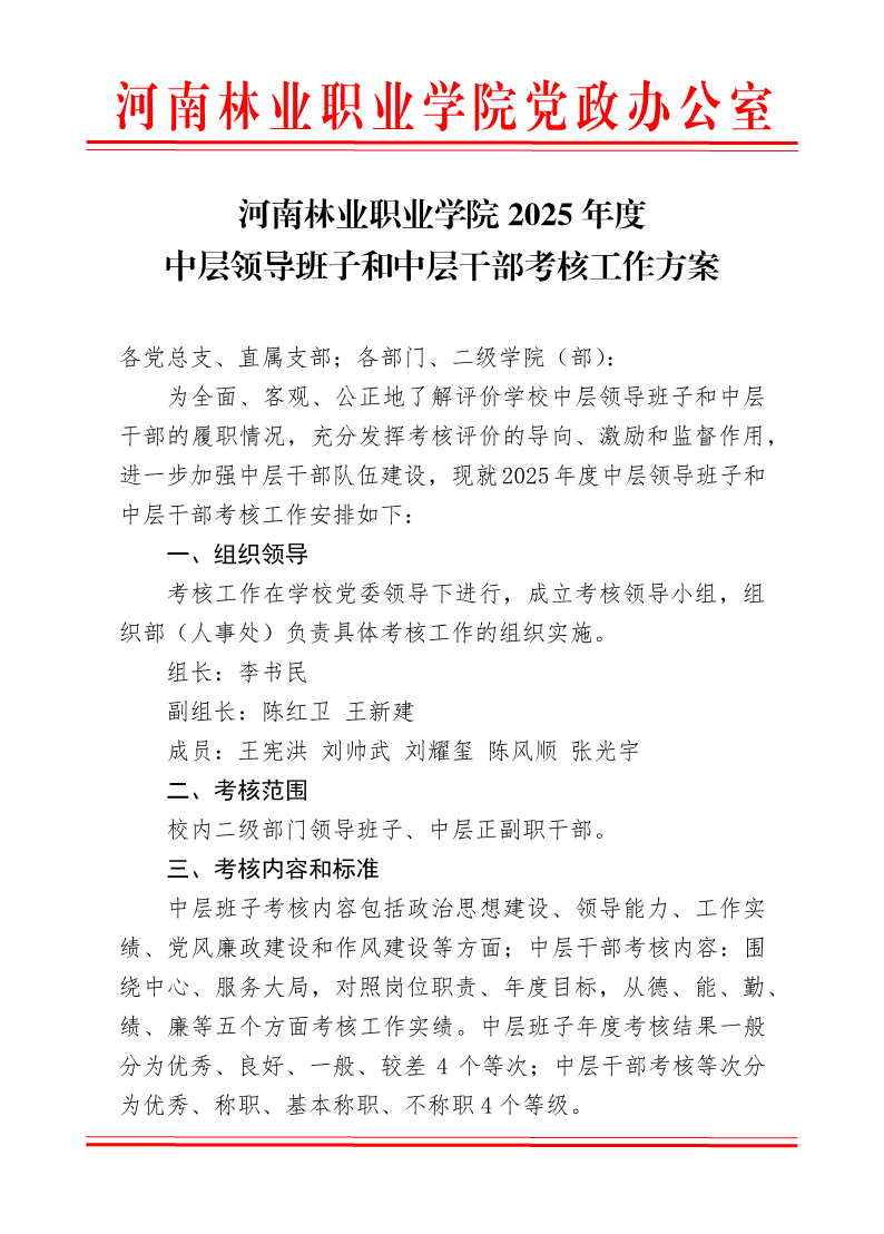 河南林业职业学院2025年度中层领导班子和中层干部考核工作方案 作者:组织部 来源:组织部 发布时间:2025-12-25 07:24:53 浏览次数: 次 【字体:小 大】 附件:1.部门班子2025年度述职述廉述学报告模版.docx2.中层干部2025年度述职述廉述学报告模板.docx3.领导班子党风廉政建设责任制自评表.docx5.“双高”建设提升工程任务完成情况统计表.xlsx6.特色工作自评表.xlsx7.工作加分统计表.xlsx8.职能部门工作自评打分表.xlsx9.一类教学单位工作自评打分表(有学生).xlsx4.年度工作要点完成情况统计表.docx10.二类教学单位工作自评打分表(无学生).xlsx字体.rar 终审:李成良 分享到: 【打印正文】