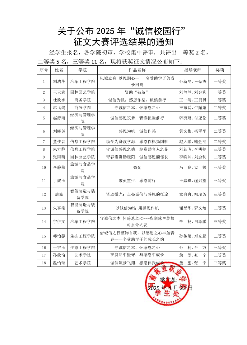 关于公布2025年“诚信校园行”征文大赛结果的通知